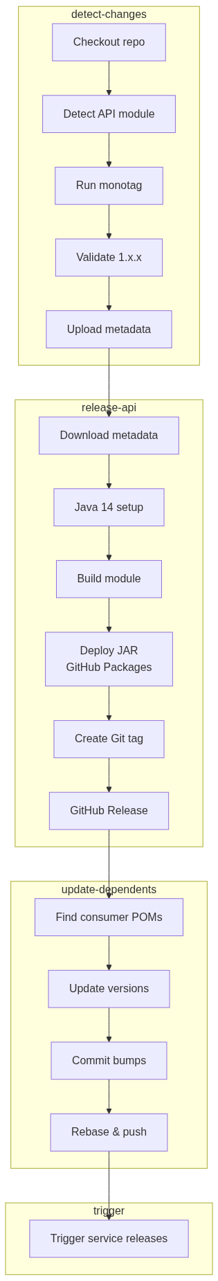 Initially, I considered a simultaneous release, but the inter-module dependencies made this impractical. The system relies on a “bottom-up” propagation model, meaning that shared contracts (API modules) must exist in the artifact registry before implementation services can successfully compile and link against them.